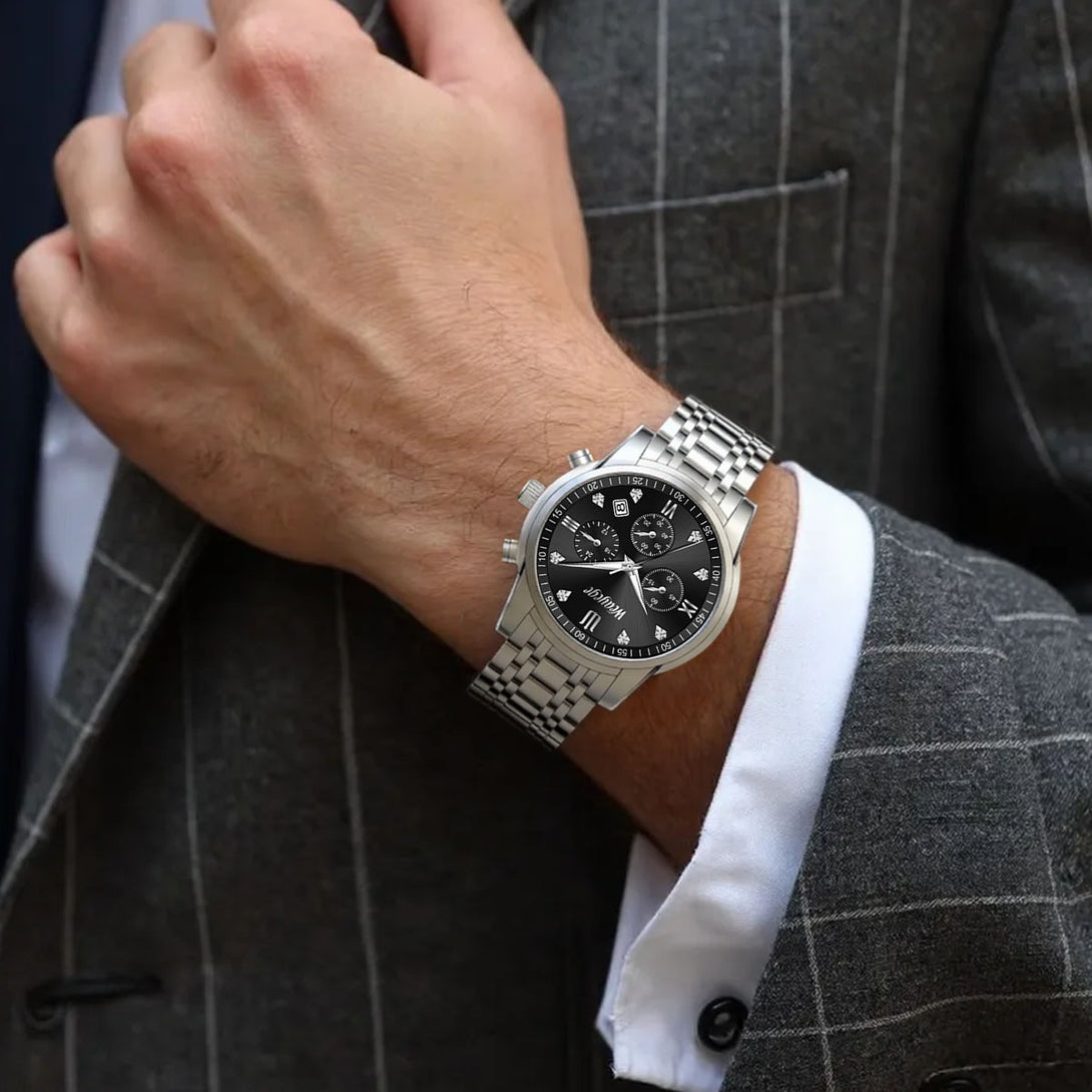 Precise Chronograph Watches: The Roman numerals and diamond indexes add a nice sense of class to the watch and will be legible. The watch's dial has three sub-dials — chronograph minutes and hours, as well as running seconds. It's a new depth and sparkle to the watch, with a nicely printed dial, well-polished case and well-crafted hands.